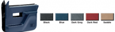 Replacement Door Panels are made from heat-resistant black plastic then painted in available colors with an ultraviolet inhibitor to prevent sun damage. Includes plastic retaining clips; armrest screws must be reused. The original door lock switch panel is reused and installed on the replacement panels.